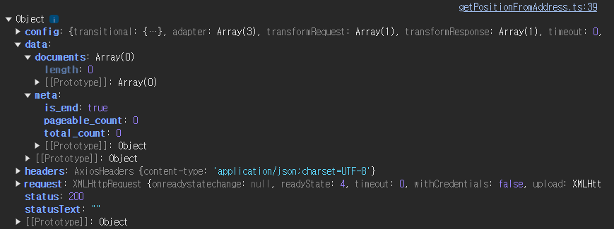 이제 아까의 도로명 주소를 검색하면 다음과 같은 위치 정보 결과를 성공적으로 반환할 수 있다.
