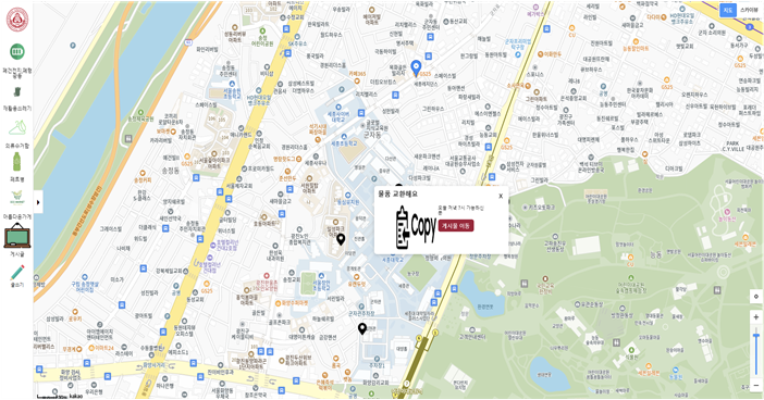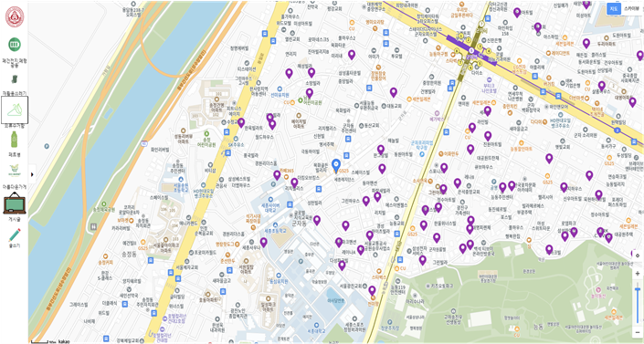 - 페이지의 왼쪽 버튼을 클릭하면, 폐건전지 수거함, 폐형광등 수거함, 의류 수거함 등의 위치를 지도로 표시해 줍니다.