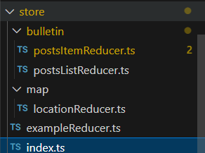 다음의 스크린샷처럼 루트 디렉토리에 index라는 이름으로 작성하기 때문에, 여러 가지 리듀서를 combineReducer()로 합친 리듀서를 리듀서로 갖는다.