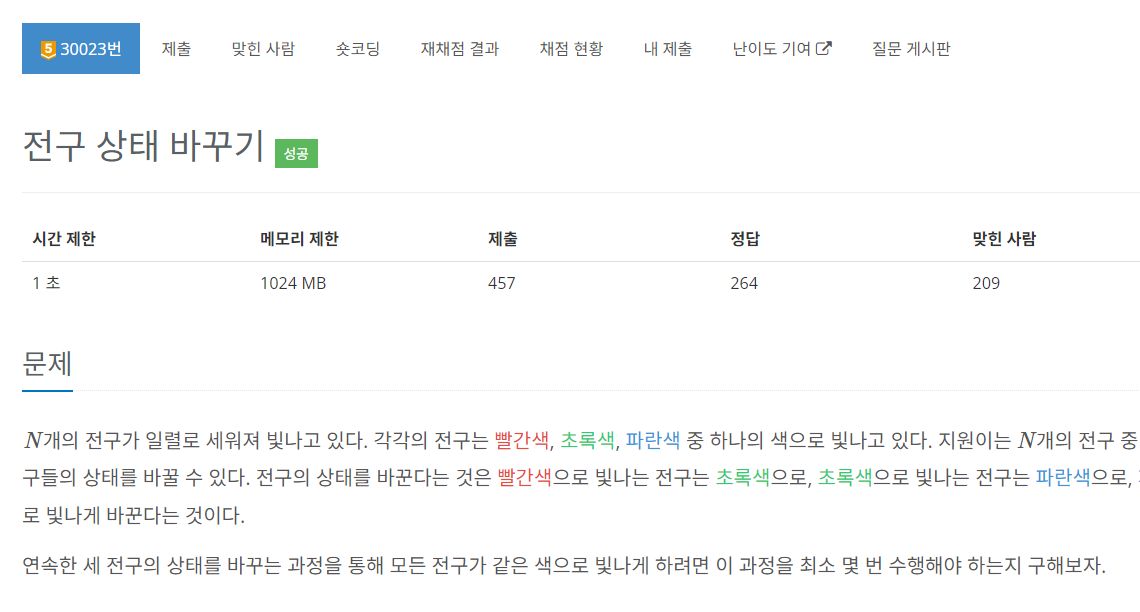 n이 100,000이니까, 모든 색을 순회한다 하면 최악의 경우100,000 * 3 * 3이다.(세 가지 색에 연속된 세 전구를 바꾸는거)