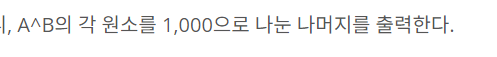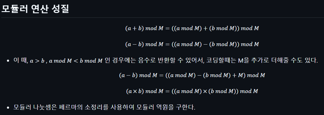 참고로, 값을 구하는 과정에서 나머지연산은 단순해보이지만 사실 모듈러 연산의 성질을 알아야한다.