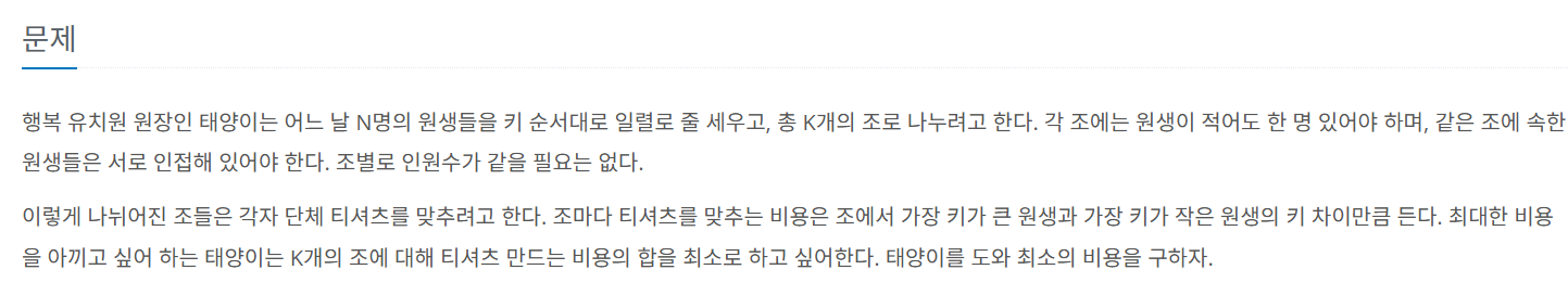 다음과 같은 문제에서는 조를 k개의 조로 나누고, 그 조의 최댓값과 최솟값의 차가 비용이다.